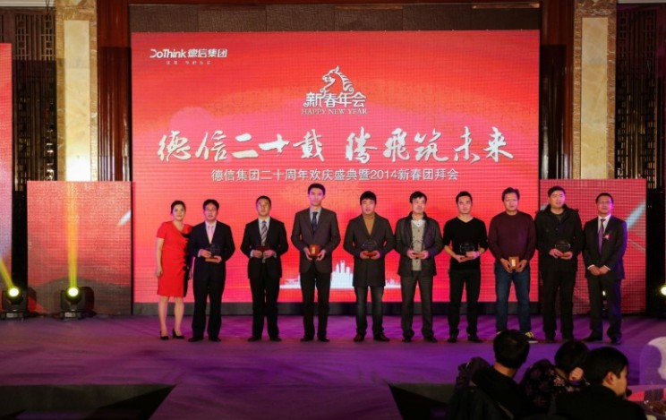 “德信二十载,腾飞筑未来”2014年1月24日,“德信集团二十周年欢庆盛典暨2014新春团拜会”在杭州海外海国际大酒店隆重举行,德信集团500余名员工与股东方代表欢聚一堂,共同分享德信集团二十年来的累累硕果。